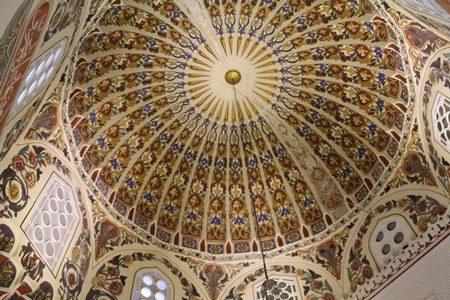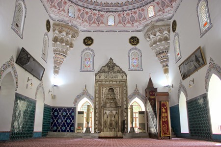 Muradiye Hudavendigar (the Muradiye Mosque Complex) is built in 1424-1426. The mosque is a simplified inverse T- plan with a domed portico in front, constructed of brick and with four major domes. Hexagonal tiles in turquoise and dark blue decorate the interior. There are two minarets, one that is old, and one that is new due to collapse from the 19th century earthquake and was rebuilt in 1904. A fire damaged the mosque in the early 18th century, and so the mihrab was also rebuilt, in the rococo style.