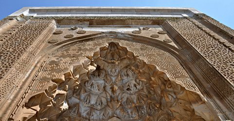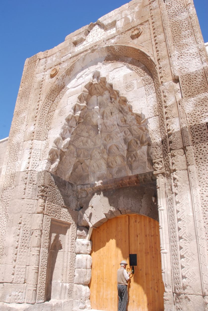 The carved decoration of Agzikarahan is notable for the absence of the human figures, animals and floral motifs typical of the period. The hamam or bath house is in the rectangular building standing apart to the south.