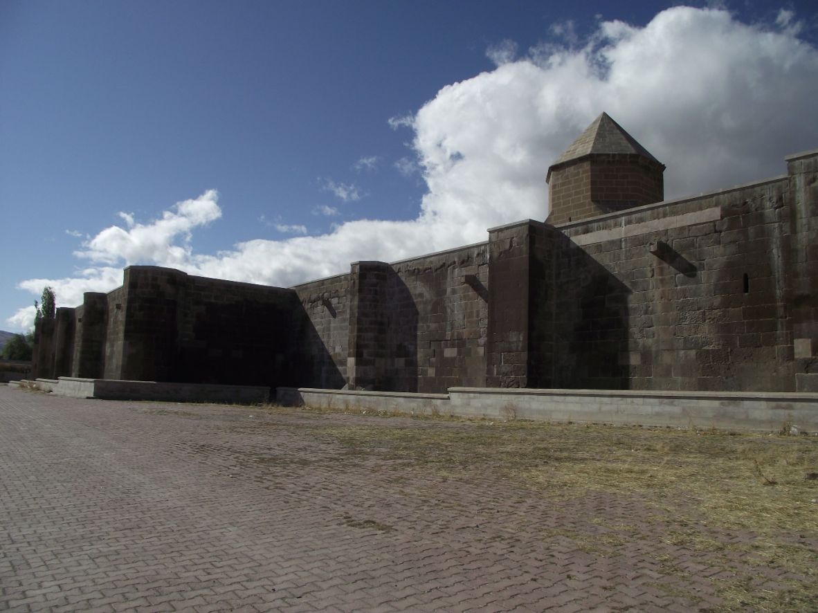 Another important caravanserai is Kayseri Sultanhani in the village of Tuzhisar 45 km from Kayseri on the Sivas Road. The inscription on its hall portal tells us that it was built between 1232 and 1236 by Alaaddin Keykubat I. This caravanserai covers an area of 3900 sq.m and its plan is similar to that of Aksaray Sultanhani. The portal in the north wall is flanked by semi-circular towers with square bases. Although this partially ruined portal is typical of classical Seljuk portals, the towers enhance its grandeur. A hall with high arches leads into the square courtyard, in the centre of which is a pavilion mosque raised on arches. On the northwest side of the courtyard is a domed hamam in five sections which is entered via a door at the northwest corner of the arcade to the right. This caravanserai was restored in 1951.