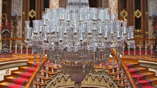 The palace is extensively decorated with gold and crystal. Fourteen tonnes of gold were used to gild the ceilings. The world's largest Bohemian crystal chandelier is in the Ceremonial Hall. The chandelier was assumed to be a gift from Queen Victoria; however in 2006 the receipt was found showing it was paid for in full. It has 750 lamps and weighs 4.5 tons. Dolmabahce has the largest collection of Bohemian and Baccarat crystal chandeliers in the world. The famous Crystal Staircase has the shape of a double horseshoe and is built of Baccarat crystal, brass and mahogany.