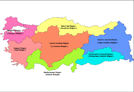 Turkey is geographically divided into seven regions: Marmara, Aegean, Black Sea, Central Anatolia, Eastern Anatolia, Southeastern Anatolia and the Mediterranean, which were originally defined at the country's First Geography Congress in 1941. These seven regions are subdivided into twenty one sections, which are further split into numerous areas as defined by microclimate and bounded by local geographic formations.