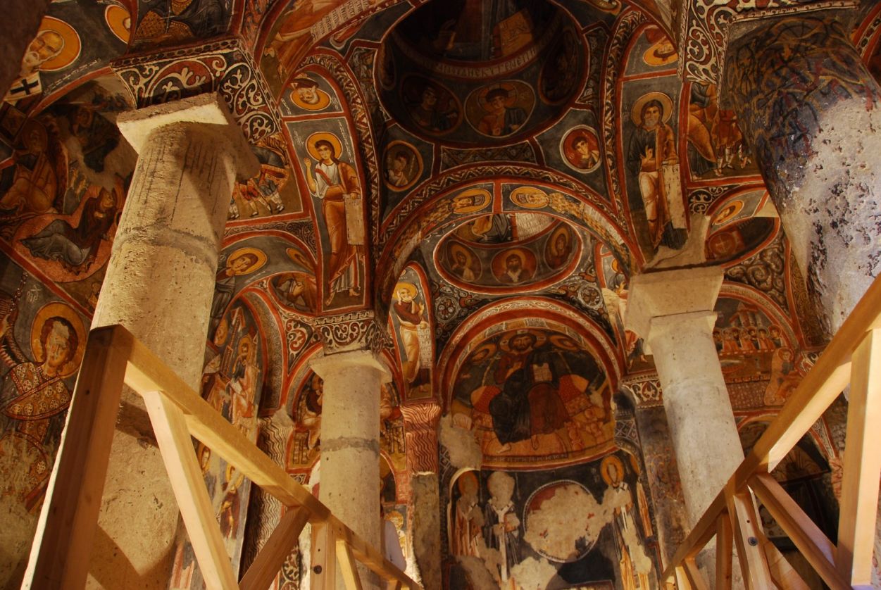 This 11th century church is the biggest carved-rock church in Cappadocia. It is on the main road to Avcilar, to the right. It is accessed after a long vestibule to the west. There used to be a shield hanging on the ceiling long time ago. This does not exist anymore but the place where it was connected to the ceiling is still visible. At the eastern end of the nave which is connected to the vestibule there are four arched columns supporting the structure. There is an elevated corridor behind this nave. The church with a shield is one of the most noticeable churches in the region with its size and spectacular frescoes.