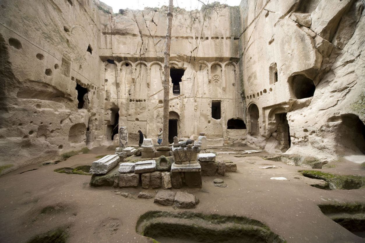 Then, continue to Cappadocia where your first visit will be to the Eski Gümüş (Monastery of Gümüşler), a monastery church carved from the rock in Gümüşler. This 10th century monastery is entered via a vaulted door. The church is situated to the north side of the courtyard, while rooms carved from the rock line the rest of the courtyard. The church is built on a closed cruciform plan, and has a central dome, four columns, cross vaults and three apses.