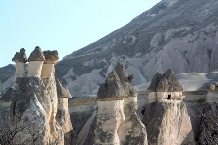 Highly remarkable earth pillars can be seen here, in the middle of a vineyard, hence the name of the place which means: the Pasha's vineyard. Pasha means General, the military rank durıng Ottoman rule and it is a very common nick name. This site is also called Monks Valley by the Westerners. The name was derived from some cones carved in tuff stones which stand apart. Currently, there is a vineyard and a number of tuff cones standing right next to the road.