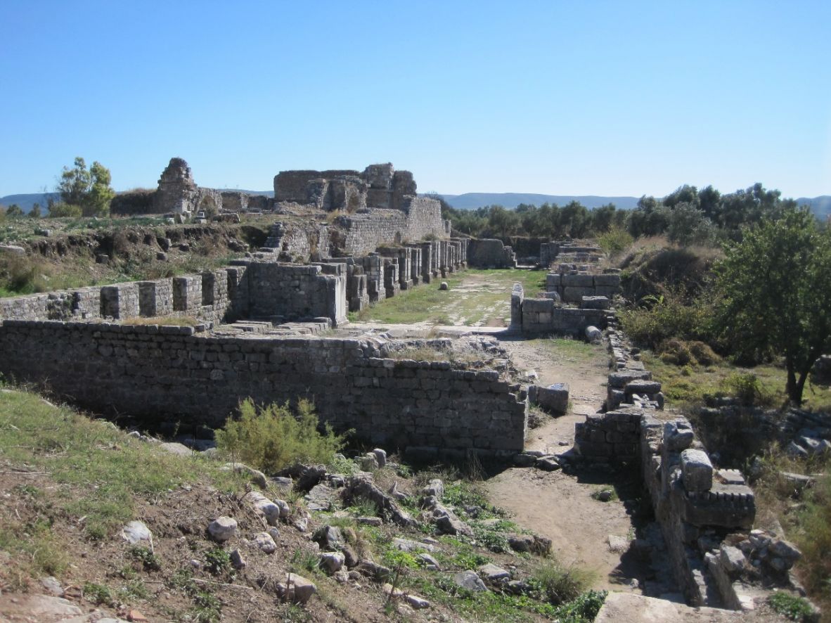 Long stretches of the Hellenistic city wall have remained intact, in some places 1,85 m wide and 5,50 m tall. Inside, the city's remains lie on successive terraces that rise from a plain to a steep hill, upon which stands the Temple of Athena.