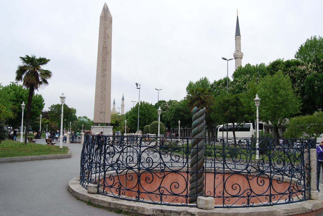 Monuments decorating the Hippodrome include the 3500-year-old Egyptian Obelisk of Theodosius, brought to Constantinople by Emperor Theodosius in 390 AD; the spiral bronze base of a three-headed Serpentine Column brought from Delphi in Greece; the German Fountain donated in 1900 to the Ottoman Empire by the German Emperor Wilhelm II after his visit to Istanbul in 1898.